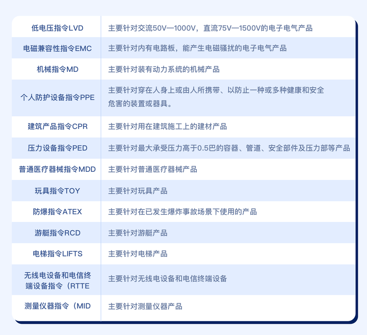 要了解CE认证的产品范围,首先需要了解CE认证具体包含哪些指令。这里涉及到一个重要概念:“指令”,是指规定了产品的基本安全要求和途径的技术法规。每一条指令都是针对具体的产品类别的,所以明白了指令的含义就可以明白CE认证具体的产品范围:
